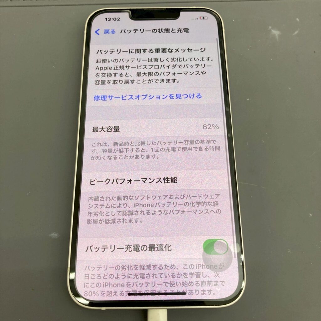こちらが修理前の状態です!!バッテリーの最大容量の数値は62%と低くなっています💦